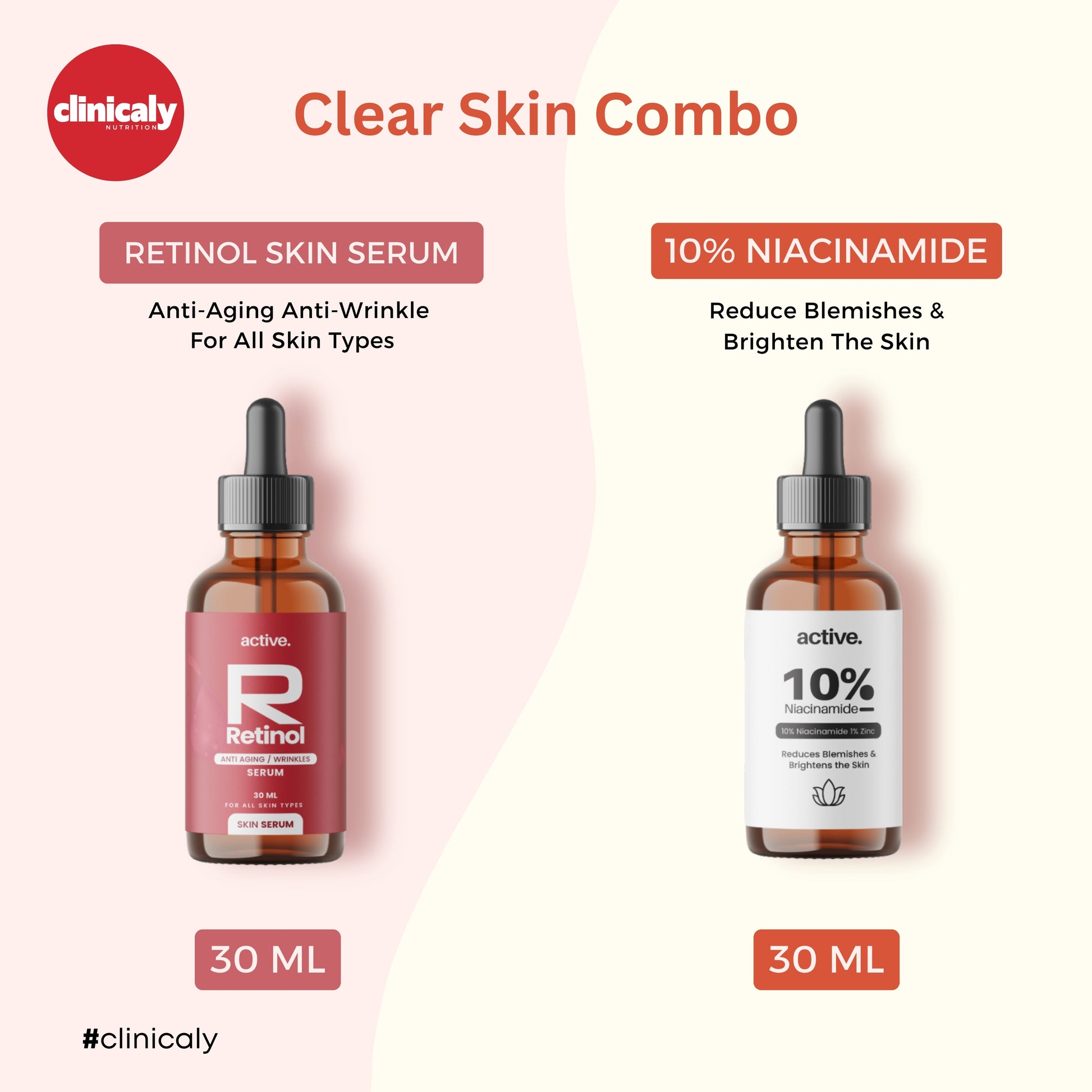 Achieve clearer, smoother skin with our Clear Skin Combo, designed to reduce blemishes and improve skin texture. This combination of 10% Niacinamide Serum and Retinol Serum helps to control oil production, reduce acne, and refine skin.